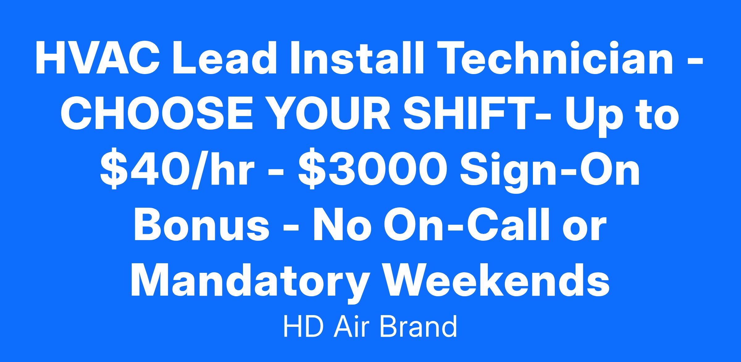 HVAC Lead Install Technician - CHOOSE YOUR SHIFT- Up to $40 / hour base ($60 / hour with incentive pay) $5000 Sign-On Bonus - No On-Call or Mandatory Weekends